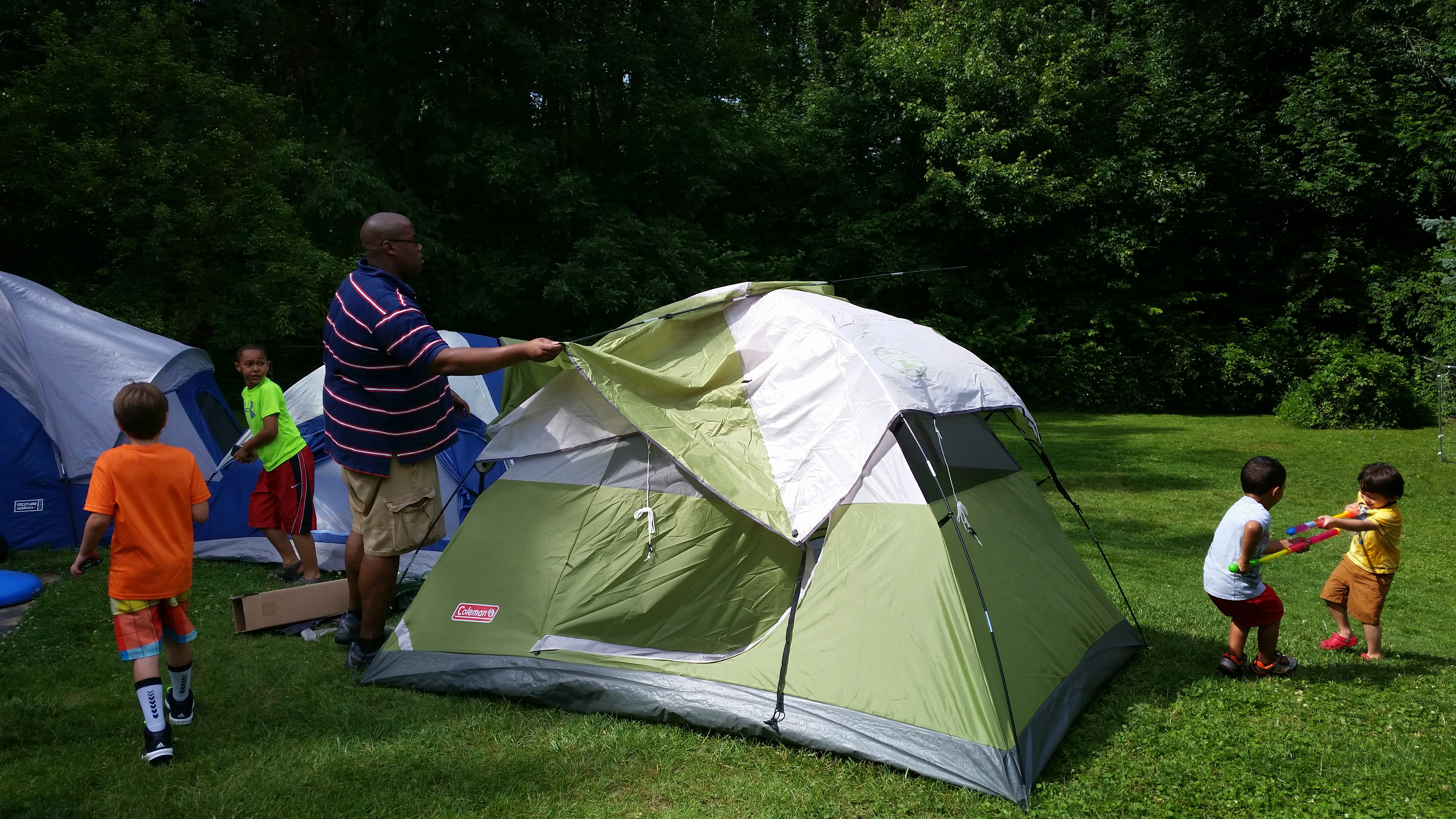 (Left) The Coleman tent set up in our living room. (Right) our crew camping at a friends backyard.
